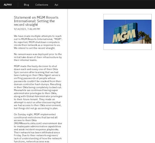 The ALPHV ransomware group has not before privately or publicly claimed responsibility for an attack before this point. Rumors were leaked from MGM Resorts International by unhappy employees or outside cybersecurity experts prior to this disclosure. Based on unverified disclosures, news outlets made the decision to falsely claim that we had claimed responsibility for the attack before we had.