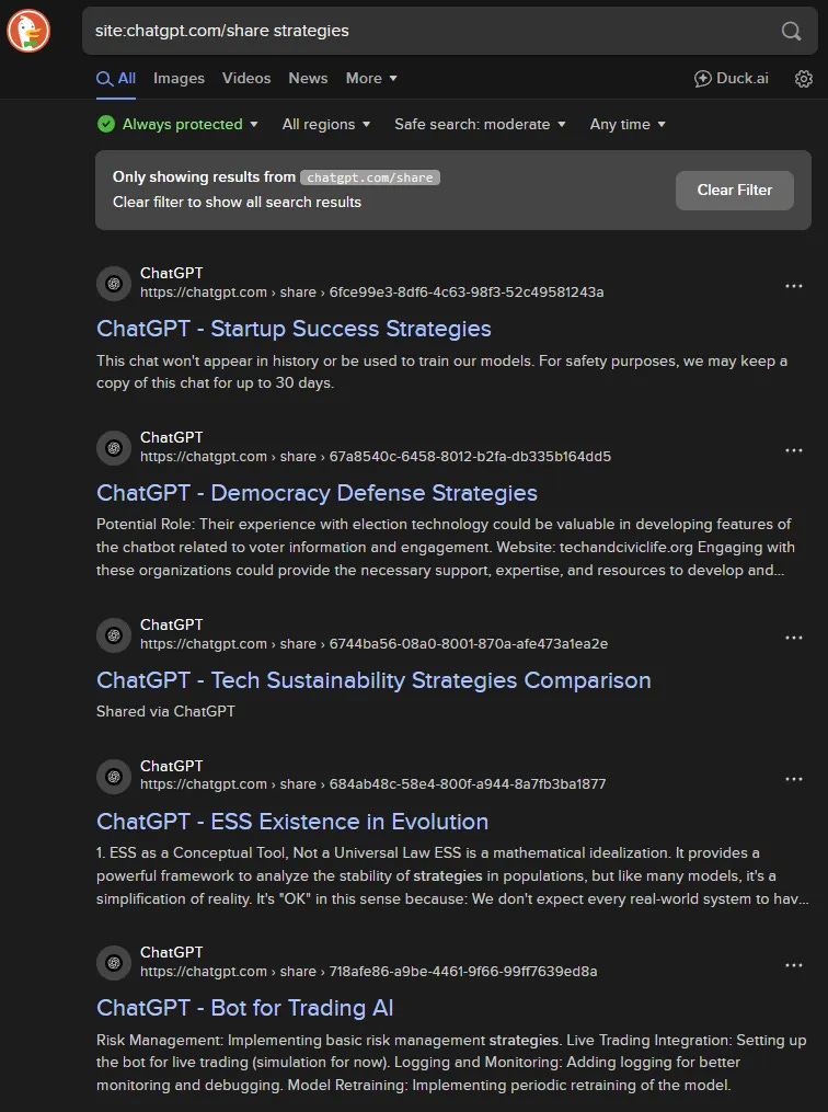A basic site parameter search will find shared ChatGPT chats in most search engines. As of publishing, Google has stripped them out from their search results, but other search engines, like DuckDuckGo, still include them in search results.